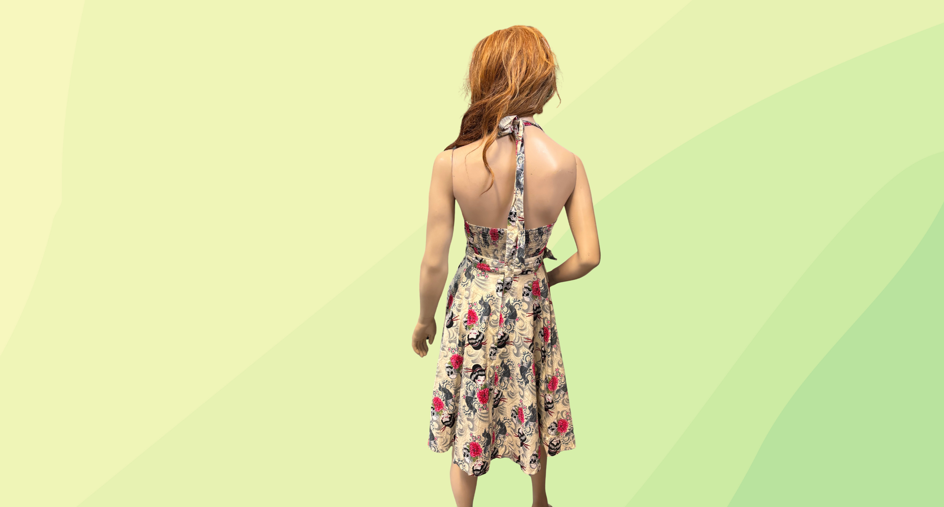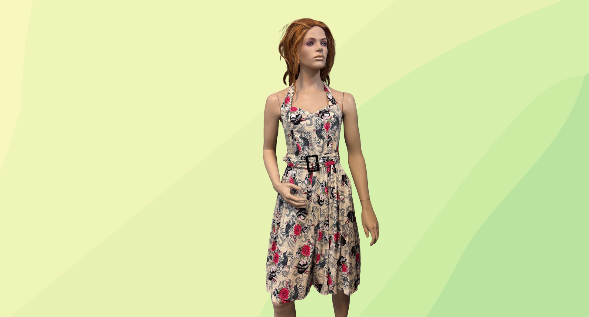 Hell Bunny Geisha Halter Dress - S - Cream/Black/Pink